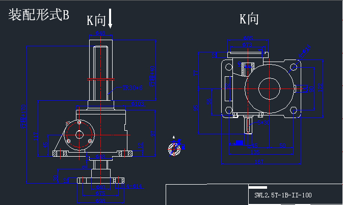 結構型式分為1型:蝸輪與螺杆為螺紋連(lián)接,螺杆作(zuò)軸(zhóu)向運(yùn)動;2型:蝸輪與螺杆為鍵連接,螺杆上配螺母(mǔ),螺杆上(shàng)的螺母(mǔ)作軸向運動。1型結構型式又分為兩種裝(zhuāng)配型式(shì)即A:螺杆工作端(duān)在上;B螺杆工(gōng)作端(duān)在下。2型結構型式(shì)也有兩種裝配型式即:A:螺杆工作端在上,螺母上頂或下(xià)拉;B螺杆工作(zuò)端在(zài)下,螺母下壓或上拉。