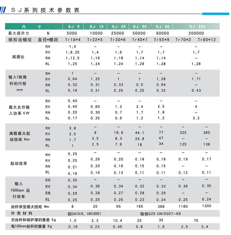 SJ係列升降機有(yǒu)_的設計,緊湊的箱(xiāng)體,比MA係列價格更低(dī),工作製也(yě)低。MA係列齒輪箱體(tǐ)設計更適合於重(chóng)負(fù)載、高工作製的場合。SJ係列的負載範圍在0.5噸~20噸之間,推杆線速度_快可達到(dào)30mm/s,輸入速度(dù)_為1500r/min;輸入形式多樣(yàng),10分鍾的工作(zuò)製為(wéi)20%,工作環境溫度(dù)為-10℃~70℃;而MA係列的負載_可達到35噸,輸入速度更是_達到3000r/min,可提供雙頭三頭絲(sī)杆和滾珠絲杆;附件配置多:限位開(kāi)關,防塵罩,安全螺(luó)母(mǔ),防反(fǎn)轉裝(zhuāng)置。10分鍾的工作製為30%(環境溫(wēn)度為-10℃~70℃)。