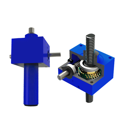 S型螺旋升降機的(de)原理為(wéi)蝸杆驅動蝸輪旋轉,蝸(wō)輪中(zhōng)間為內螺紋孔機構(gòu)(與絲杠相齧合(hé)),再將旋轉運動傳遞至絲杠(gàng)上下直線運動(dòng)。