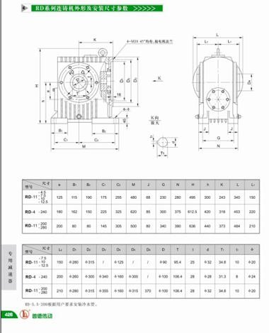 型號(hào) 中心距 速比 輸入(rù)功率(kw) 輸入轉速(r/min) 傳動效率(%) 允許工作油溫 用途RD-11-4.5-Ⅲ 125 4.5 11 1500 90 10~100 ①RD-11-4.5-ⅢA 125 4.5 11 1500 90 10~100 ①RD-11-7.5 125 7.5 11 1750 90 10~100 ①RD-11-10.5 125 10.5 11 1750 90 10~100 ①RD-11-12.5 125 12.5 11 1750 89 10~100 ①RD-4-240 180 240 4 1500 63 10~100 ②RD-5.5-200 200 200 5.5 1500 66 10~100 ③RD-5.5-280 200 280 5.5 1500 60 10~100 ③ ①振(zhèn)動裝置 ②引錠杆存放裝置 ③ 拉矯機
