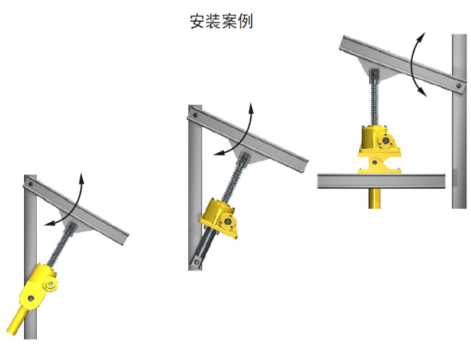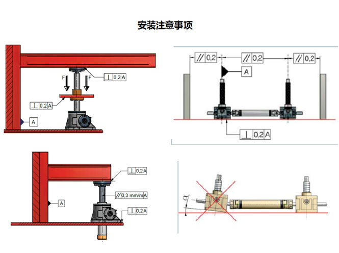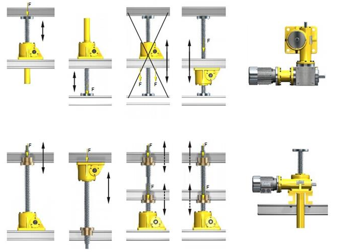 螺旋絲(sī)杆升降機安裝時應注(zhù)意不同結構型(xíng)式、不同頭部(bù)型(xíng)式的安裝方法,錯誤的安裝方法(fǎ)將會對絲杆升降(jiàng)機造成嚴重的損壞。下麵我們來通過幾張圖例了解一(yī)下(xià)蝸輪(lún)絲杆升(shēng)降機的安裝注意事項: