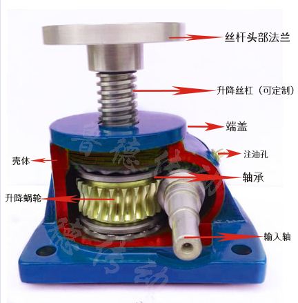 絲杆升降(jiàng)機原理是電(diàn)機帶動蝸杆轉動,利用蝸輪(lún)蝸杆的傳動(dòng),使蝸(wō)輪(lún)旋轉,蝸輪中心是內螺紋結構,相當於升降絲杆的(de)螺母,和升降絲杆相匹配,與絲杆配合,蝸輪旋轉帶動絲杆做軸向運動。