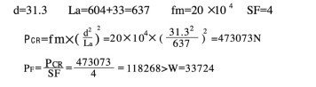 ⑤絲杆穩定性校核:以為施加壓縮載荷,所以按照絲杆穩定性校驗計算(suàn)公式進行校核,在根據JWB050US尺寸圖得出(chū)L=637取安全係數(shù)=4