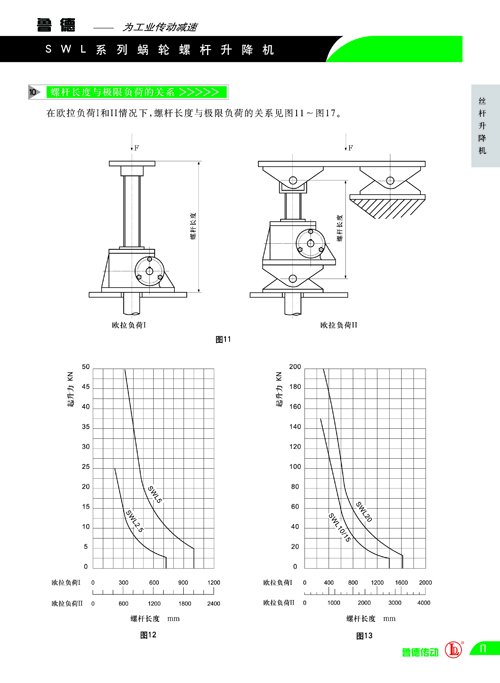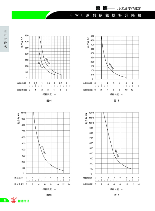 上圖給出了允許彎曲力矩下,螺杆(gǎn)的長度與_負荷的關(guān)係。根據螺杆(gǎn)的行程和起升負荷,查出所需升降機的型號,再根據查出的(de)升(shēng)降機型號和起升(shēng)負荷(hé)查出(chū)蝸輪絲杆升降機的(de)在不同起升負荷下允許的起升速度,若查出的起升速度滿足不了要求,則須選用(yòng)型號大一規格的升降機,直至滿足(zú)要求。