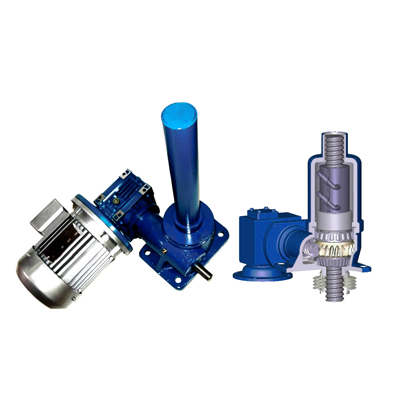 螺旋升降機的原理為蝸杆(gǎn)驅動蝸輪旋(xuán)轉,蝸輪中間為內螺紋孔機構(與絲杠相齧合),再將旋轉運動傳遞至絲杠上下直線(xiàn)運動。