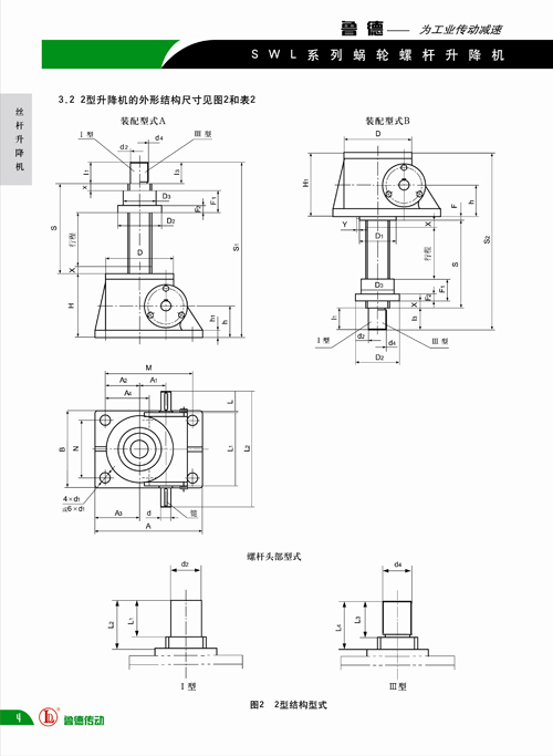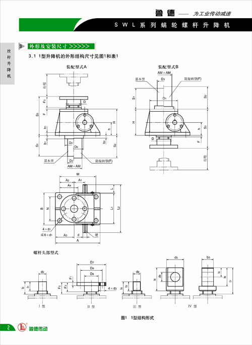 SWL蝸輪螺杆升降機規格型號有2.5T、5T、10T、15T、20T、25T、35T、50T、100、120T十種。結(jié)構型式分為:蝸輪與螺(luó)杆為螺紋(wén)聯接,螺杆作軸向運動型;蝸輪與螺杆為鍵聯接(jiē),螺杆上配螺母,螺杆上的螺母作軸向運動兩種(zhǒng)型式。有不同的裝配型式和絲杆頭部形式(shì)可選(xuǎn),速比有普通速比和慢速比兩種。