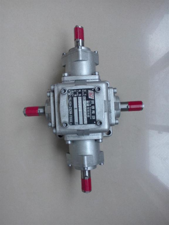 ,雙(shuāng)輸入軸,雙(shuāng)輸出軸,內部有兩對傘齒輪,雙脖子的輸入方向相(xiàng)反,中間通軸的輸出方向相同。