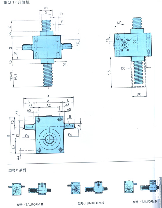 TP係列升(shēng)降機,TP升降機:TP機械絲杠升降(jiàng)機操作簡單,可靠(kào)性強(qiáng),低維修率等優點, 使螺旋千(qiān)斤頂有著廣闊的應用範(fàn)圍.TP機械千斤頂配有自 動連鎖機構,即(jí)他們能支撐自身(shēn)重量而不必(bì)采用閘或其它 鎖(suǒ)定係統.千斤頂可單獨使用也可與(yǔ)軸、聯軸節,傘齒(chǐ)輪傳動器結合共同使用。他們可由交流或直流電(diàn)機驅動,也可由液(yè)壓或氣壓電機驅動,他們可手動驅動也可用其(qí)它傳動形式;
