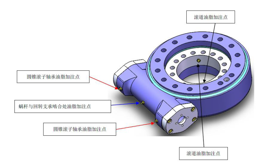 減速機有(yǒu)三(sān)處(chù)需(xū)要(yào)加以潤滑,分別為回轉支承滾道、蝸杆與回轉支承齧合處和圓錐滾子軸承。回轉支承滾道和圓錐滾子軸承出廠前已經加注潤滑脂,蝸杆與